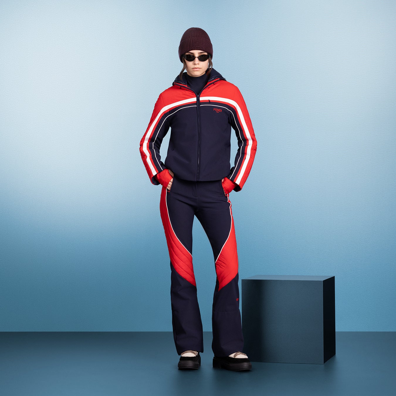 「FF」ロゴモチーフが印象的なスキージャケットは、テクニカルナイロン製のジャカードファブリックを使用。ブラックのLycra®を使用した防風性の高い長めの袖口とシープスキンのフードライニングが高い保温性を提供します。同デザインの伸縮性のあるハイウエストパンツと組み合わせれば、スタイリッシュなセットアップが完成します。クロップド丈のハイネックスキージャケットはタバコカラーのアイコニックな「FF」ロゴジャカードキャンバス製。ベージュのテクニカルファブリックで施されたカラーブロックデザインが特徴で、ブラックリボンで縁取られたポケットもアクセントになっています。また、テクニカルファブリック製のハイネックのフード付きスキージャケットは、コントラストの効いたストライプのカラーブロックデザインで展開。胸元には「Fendi Roma」ロゴが刺繍され、2色登場します。