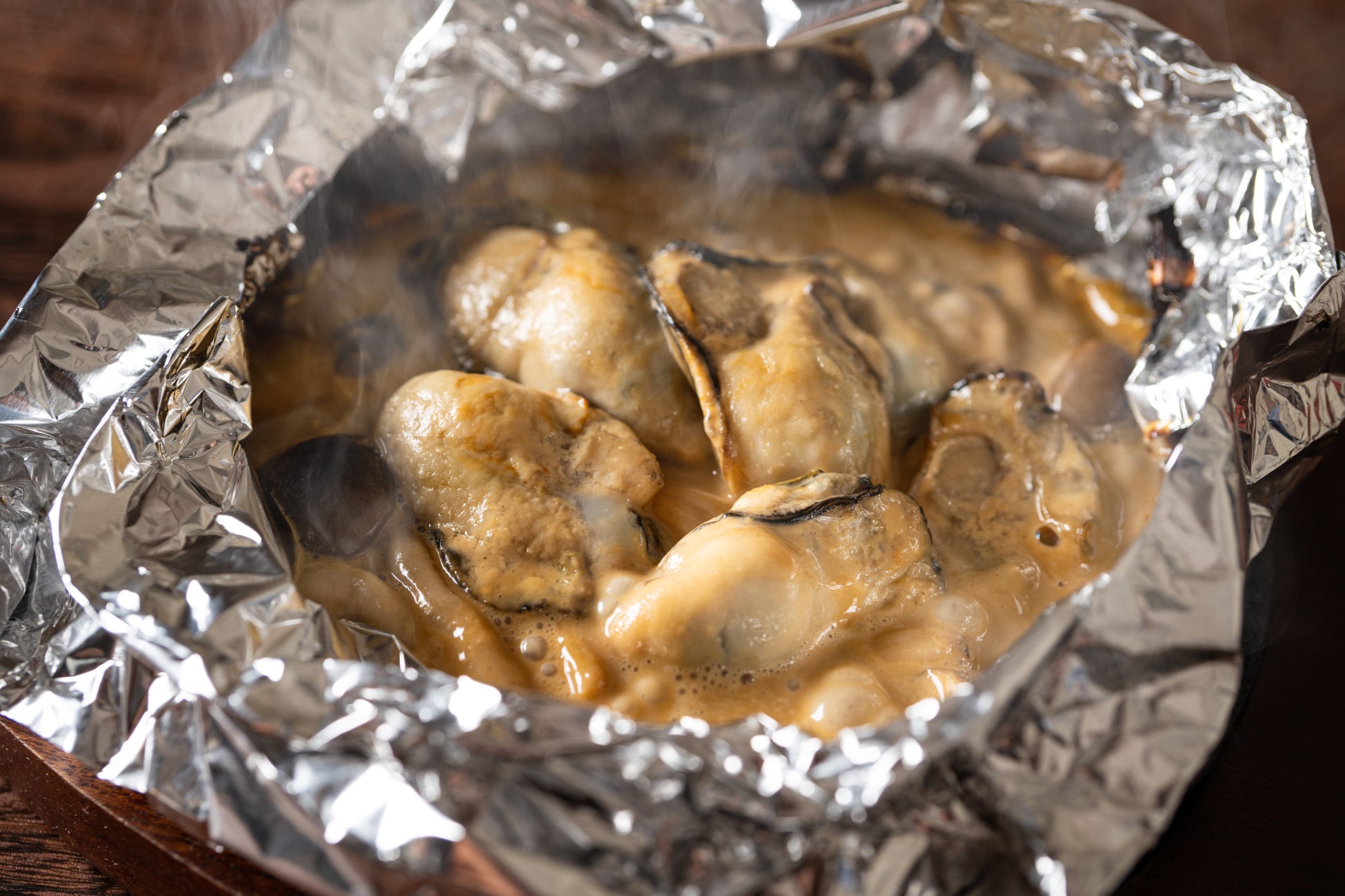広島県産の真牡蠣を、特製のイカわたソースに絡めてホイル焼きにしています。