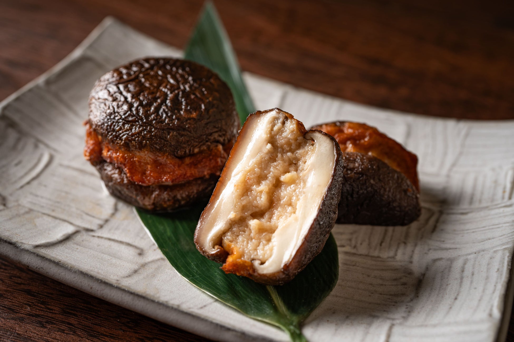 「大杉椎茸のさつま揚げ」は、香りよく緻密な肉質でちょうどよい水分を抱え込んだ小ぶりな傘の椎茸に、地鶏のつくねなどの肉だねを挟んで揚げています。
