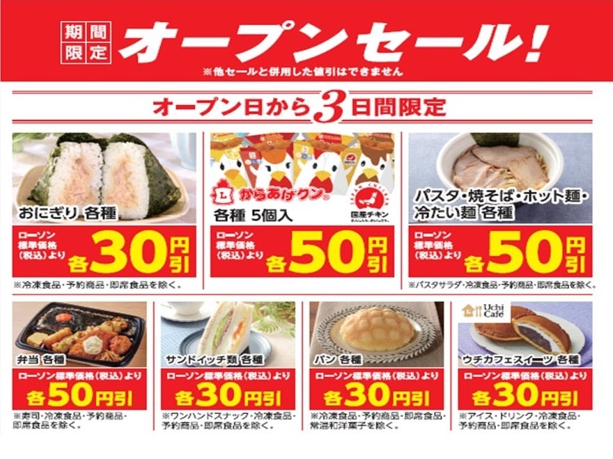 3月17日(金)~3月19日(日)の3日間は、オープンセールを開催。お弁当やおむすび、からあげクンなどの対象商品を30円~50円引で販売します。