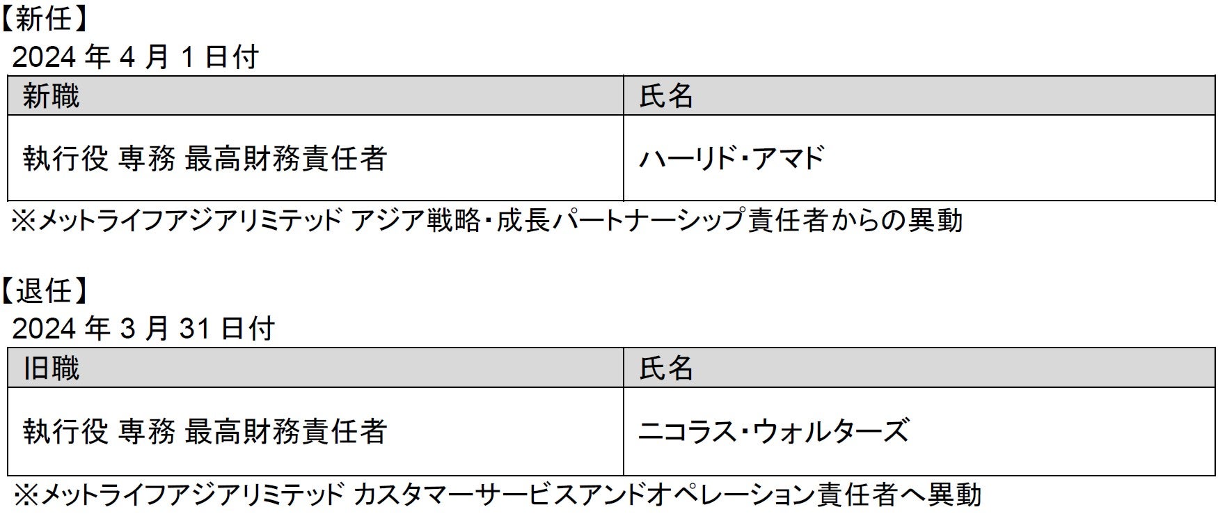 メットライフ生命保険株式会社(代表執行役 会長 社長 最高経営責任者 ディルク・オステイン)は、 以下のとおり人事異動を決定しましたのでお知らせ致します。
