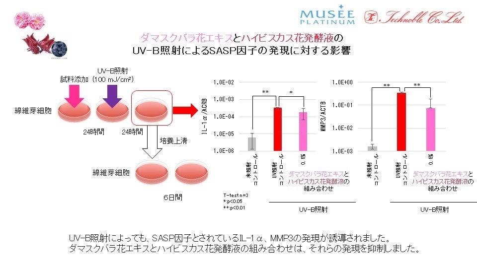 線維芽細胞の培養系に試料を添加して培養後、紫外線照射処理を行い、24時間後の遺伝子発現を評価したところ、SASP因子(※4)であるIL-1α、MMP3は、紫外線照射で発現亢進し、ダマスクバラ花エキスとハイビスカス花発酵液の組み合わせを添加することによって抑制されました。