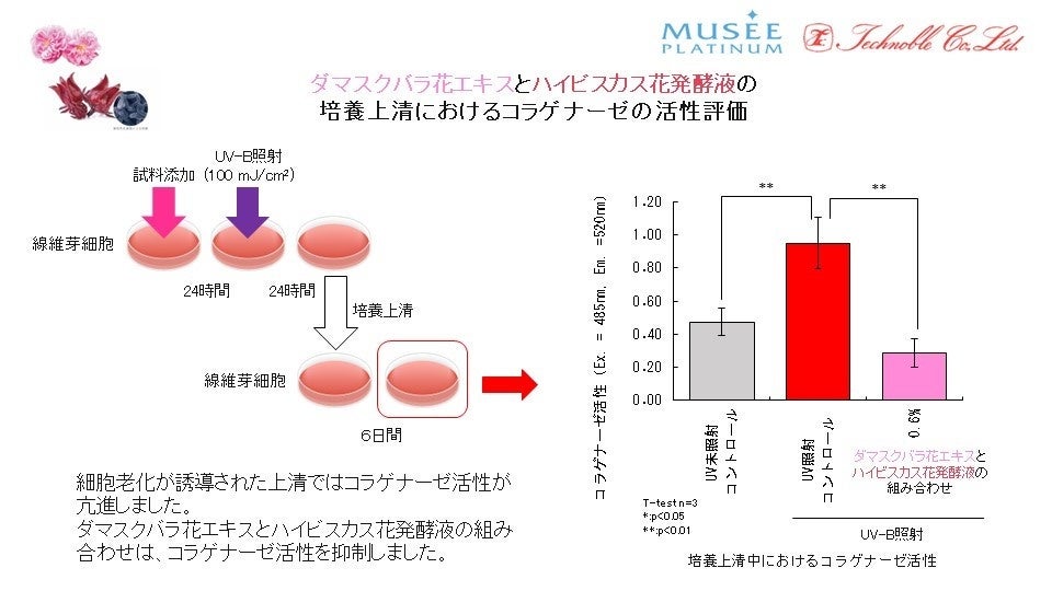 ・ダマスクバラ花エキスとハイビスカス花発酵液の組み合わせによる コラゲナーゼ活性抑制効果