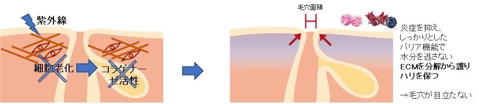 ダマスクバラ花エキスとハイビスカス花発酵液の組み合わせは、細胞老化を抑制することでI型コラゲナーゼ活性を抑制し、ECM(※5)を分解から護る効果が示唆されました。以上の結果から「たるみ毛穴」を改善し、毛穴を小さく目立ちにくくさせる効果につながることが示唆されました。