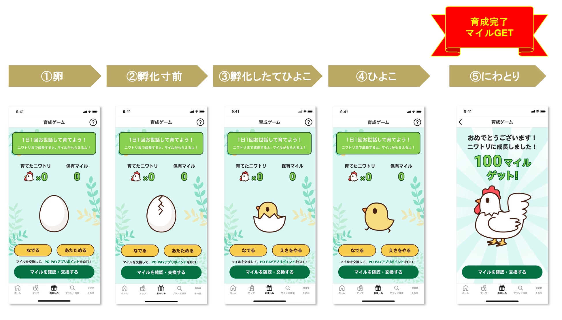 新たに搭載する「育成ゲーム」は、タマゴをニワトリに成長させることでマイルを貯めることができるものです。マイル数に応じてアプリ内の決済サービス「PO PAY※」のアプリポイントに交換が可能で、プレミアム・アウトレットでのお買い物でのご利用で、さらにお得なショッピングをお楽しみいただけます。