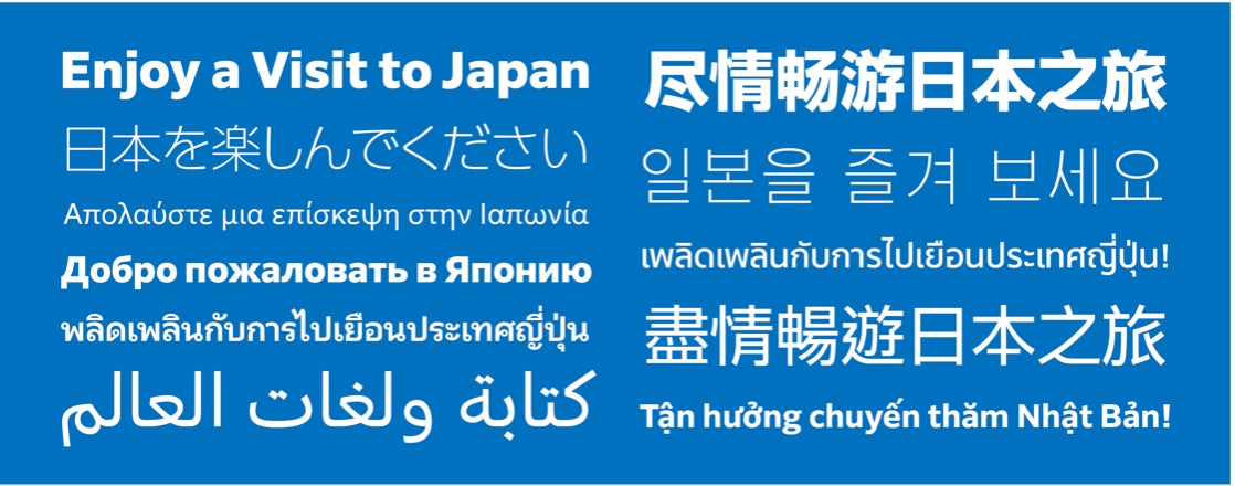 UD新ゴシリーズは視認性が高く、読み間違えにくいデザインを採用したUD(ユニバーサルデザイン)フォントです。日本語(和文)に加え、中国語(簡体字・繁体字)、韓国語(ハングル)に展開しています。また、UD新ゴシリーズとの併記を目的として開発したClarimo UDシリーズは、英語やフランス語などに対応したラテンアルファベットのほか、ロシア語などのキリル文字、ギリシャ文字、ベトナム語をカバーする欧文、アラビア文字(アラビア語やペルシア語などで使用される)、デーヴァナーガリー文字(ヒンディー語やネパール語などで使用される)、タイ文字(主にタイ語などで使用される)など、150を超える言語に対応しています。UD新ゴ、Clarimo UDシリーズは、異なる言語でも統一感のある表現を可能にすることができます。