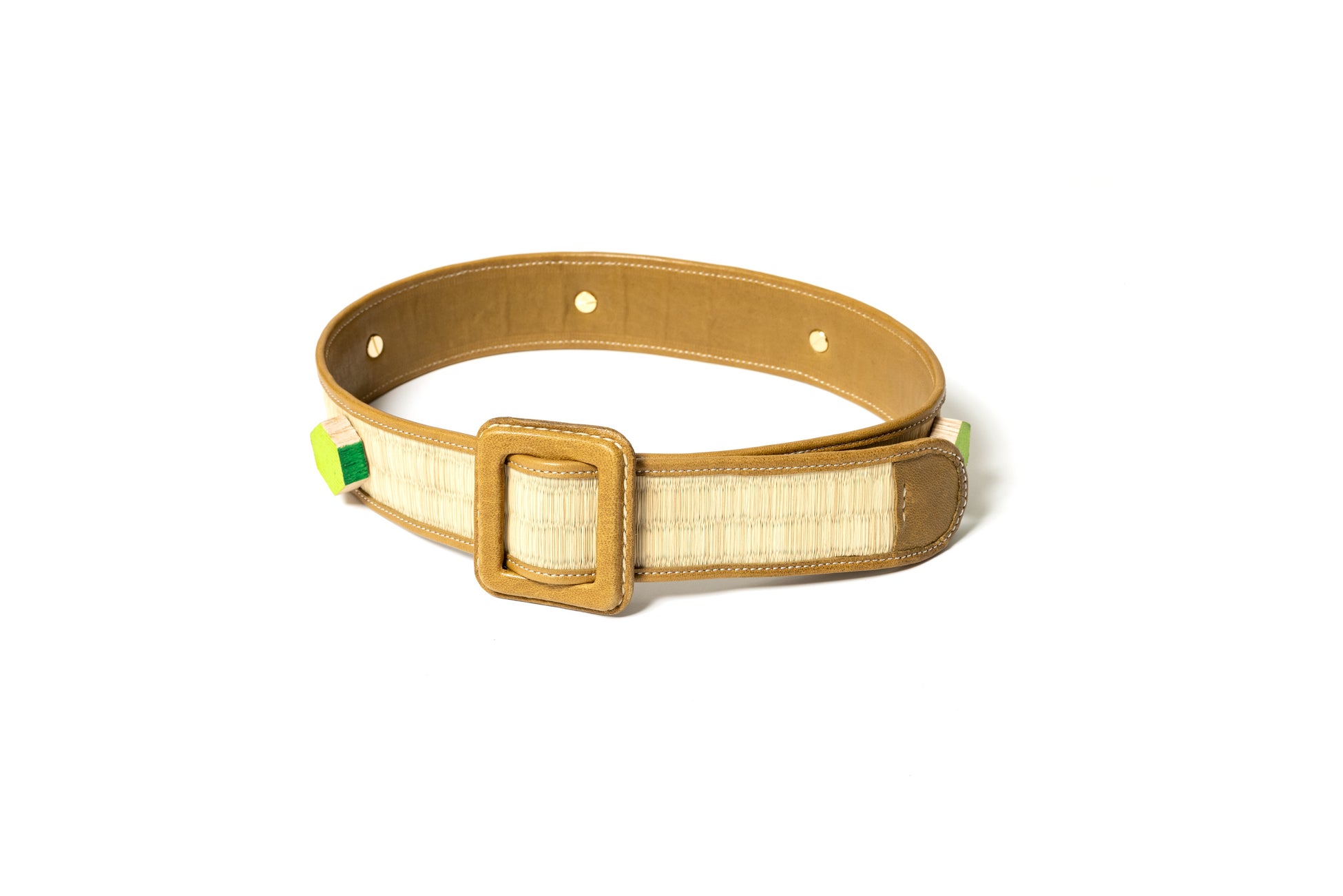 木工はタモ材で野球のバットにも使われる硬い木材。形はヘキサゴンのイメージとパンク、とんがったイメージで作りたかったため、シングルハンガーバッグと同じイメージで、もう一度このベルトに注目してもらえるようなデザインに仕上げました。