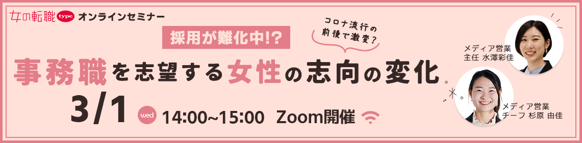 <3月1日開催>採用が難化中?!事務職を志望する女性の志向の変化/女の転職type人事向けオンラインセミナー
