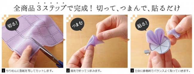 〇切って、つまんで、貼って咲かせる「つまみ細工」、初心者の方からもっと作りたい方まで豊富にラインナップ。(カタログ83ページ~)
