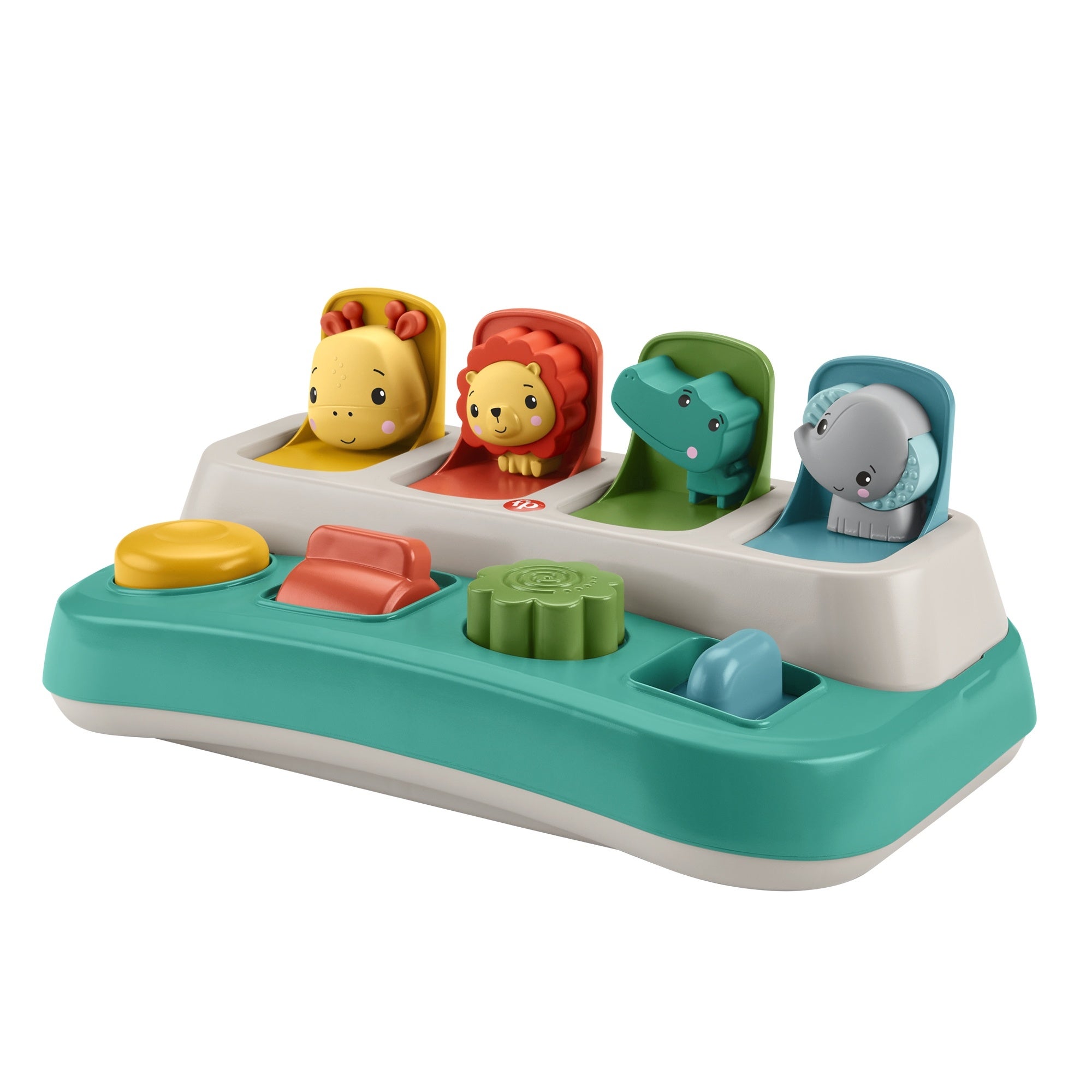 しかけの違う4種類のボタンを押す・たおす・回す・スライドすると、ゆかいな音とともに動物がぴょっこり飛び出します。小さな動物園でいろいろな動物を見つけて隠して何度も楽しむことができる商品です。指遊びで手指の発達を促すのはもちろん、どうすると動物が飛び出すのか因果関係を理解し、思考を刺激する知育おもちゃです。