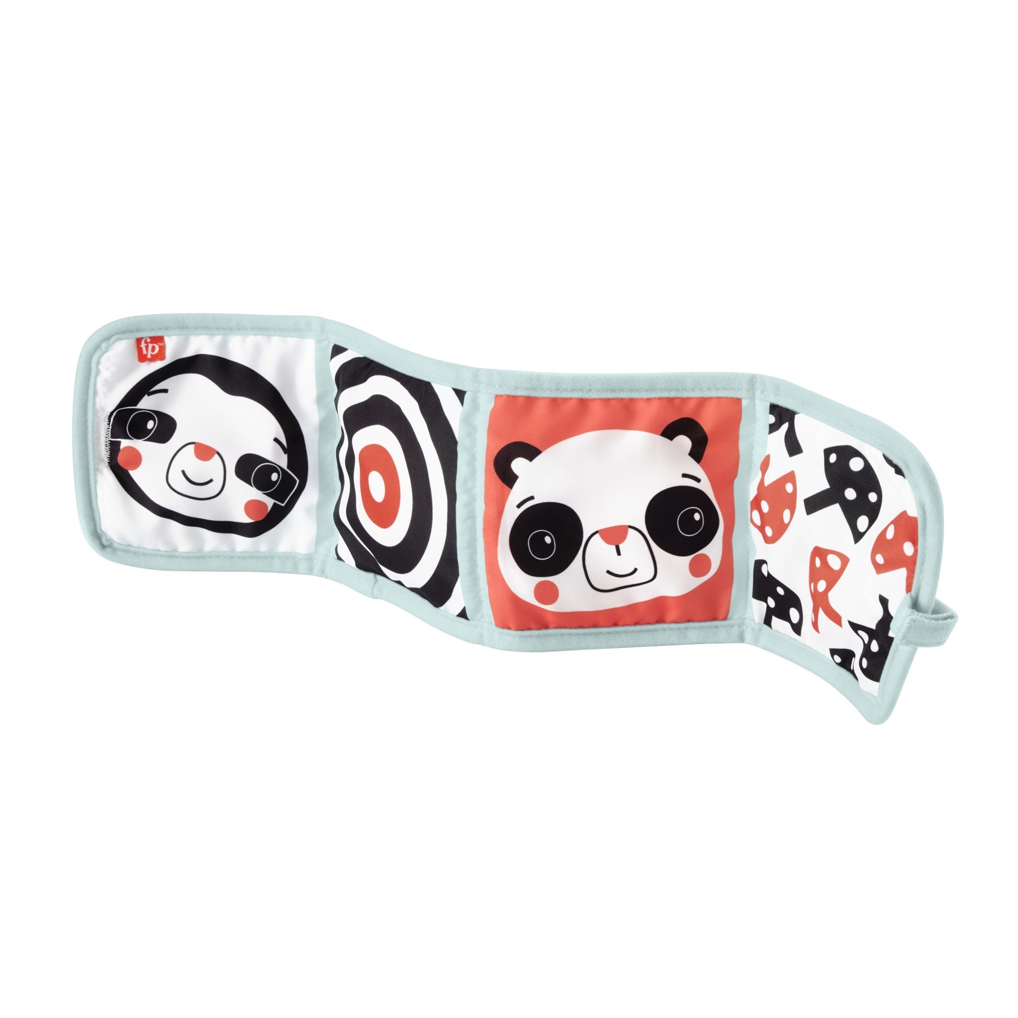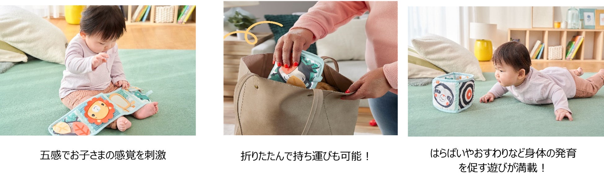 触るとクシャクシャ音がなるなど、様々な指あそびで脳と感覚を刺激し、また広げる・たたむ・立てかける動作によりはらばいやおすわりで遊ぶことで、体幹や首を支える力など身体の発育を促す遊びが満載。裏面は視認性の高いハイコントラストなデザインでお子さまの視覚と触覚を刺激します。また折りたためばカバンにしまうことができるので持ち運びにも便利です。