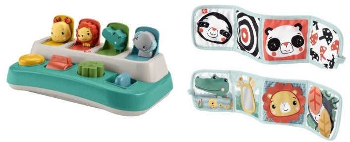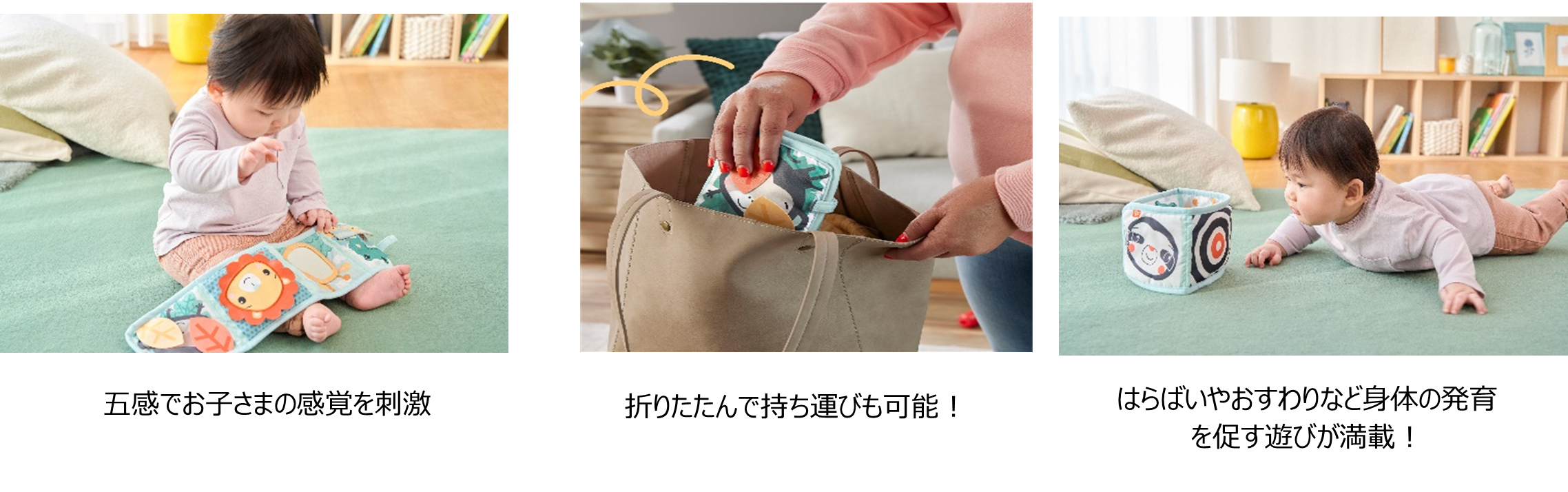 【Point】 ✓ 90年以上の歴史をもつベビー・プリスクール向け玩具グローバル売上No.1*ブランド 「フィッシャープライス」。* The NPD Group/2021/USD ✓ 「感覚を育てよう!ボタンでひょっこりどうぶつえん」は、しかけの異なる4種類のボタンを押したり 回したりすると動物が飛び出す!手指の発達だけでなく、因果関係の理解などお子さまの思考も 促します。 ✓ 「ひろげて発見!どうぶつのぱたぱたパネル」は、しかけいっぱいの指遊びで視覚・触覚・聴覚に 働きかけ、遊びながら、はらばいやおすわりなど体の発育をサポートします。布製で軽くこれからの 季節の、ベビーとのおでかけにもぴったり。 |