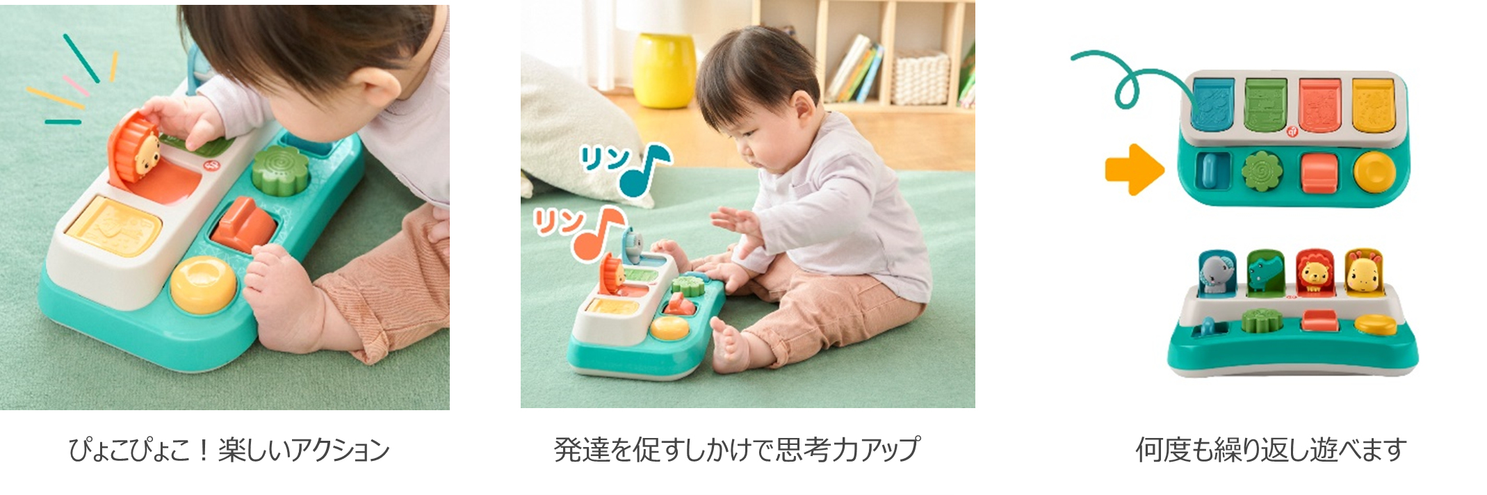 しかけの異なる4つのボタンで感覚・思考も発達「感覚を育てよう!ボタンでぴょっこりどうぶつえん」しかけいっぱいの指遊びで感覚を育てはらばいを促す「ひろげて発見!どうぶつのぱたぱたパネル」4月下旬より発売