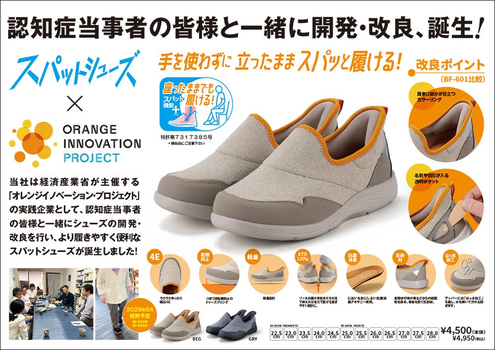 手を使わずにスパッと履ける「スパットシューズ」は、当社が2021年から行っている福祉施設への靴の訪問販売サービス「HOME de SHOES(ホームでシューズ)」でも、施設のご利用者様から高いご支持をいただいております。今回のプロジェクトでは、当社プライベートブランド「bio fitter」から発売しているスパット機能搭載のサポートシューズBF-601W/Mをベースに、認知症当事者の皆様のご意見を元に改良を重ねました。履き口がわかりやすいカラーリングや、他人の靴と間違えないように名前カードの入るポケット、従来の介護系シューズにありがちな地味なカラーでなく、気分の上がるファッション性の高いカラーリングなど、認知症当事者の皆様だからこそ感じる消費者ニーズを盛り込み、より履きやすく便利なスパットシューズ「BF-605W/M」が誕生いたしました。こちらの商品は2026年6月発売予定です。