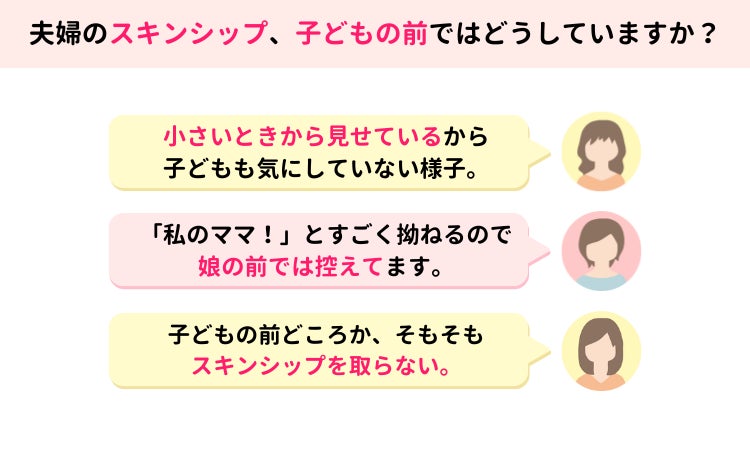 「普段はスキンシップをとるが子どもの前ではスキンシップをとらない」と回答した人は19.7%。理由としては、「私のママ! と拗ねるので娘の前では控えています」「小学校で異性のお友達に同じようなことをすると心配なので控えている」といった声が挙げられました。