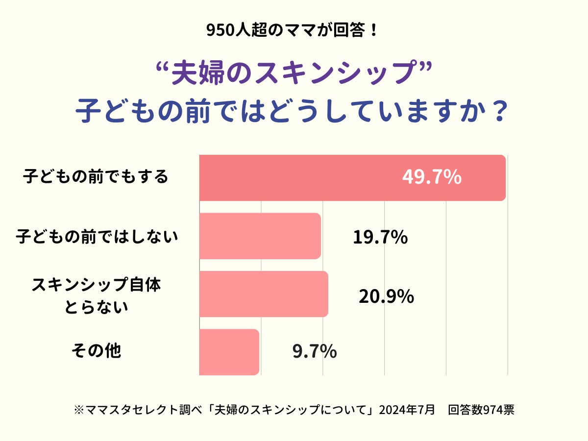 選択肢には「子どもの前でもする」「子どもの前ではしない」「スキンシップ自体とらない」「その他」の4つを設定。加えて、お子さんの年齢や性別、両親のスキンシップを前に子どもたちがどう振る舞うかについても聞き、974人のママたちから回答を得ました。