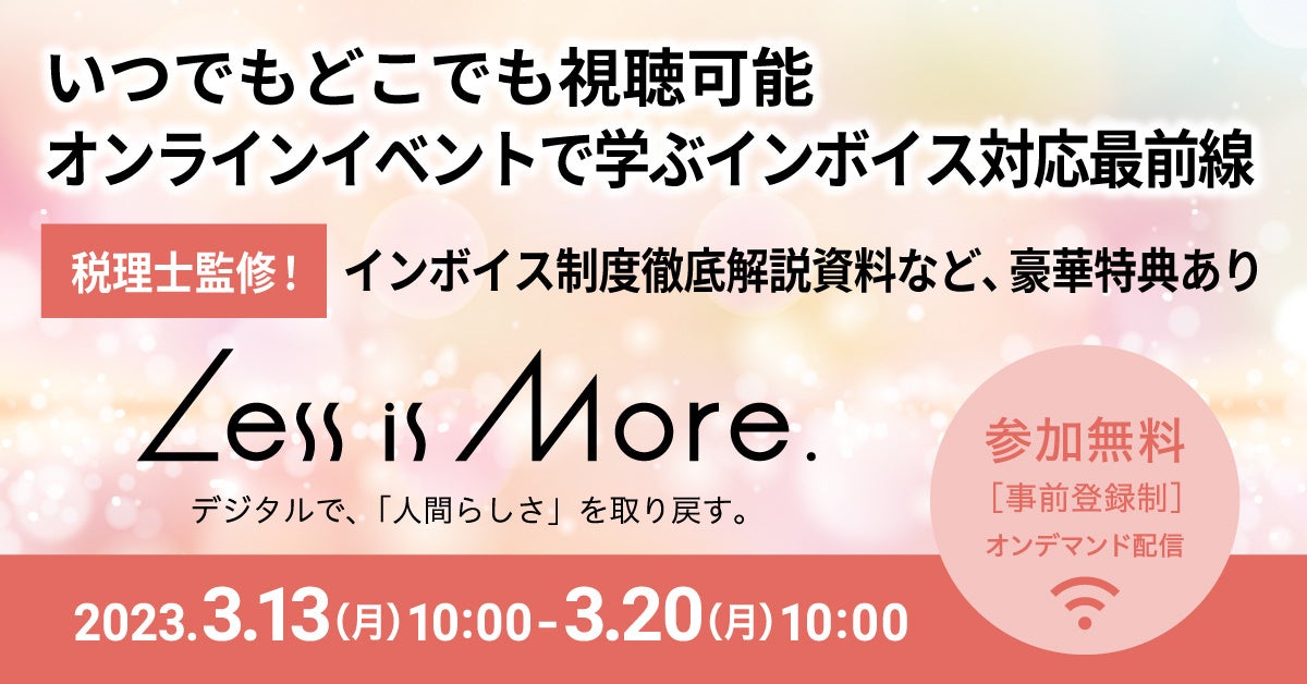 そこで今回の「Less is More.」では、税理士によるインボイス制度の基礎やツール選定のポイント、ツール導入の際の補助金制度等、あらゆる情報を解説します。さらに、電子請求書サービスのベンダー企業が一堂に会し、請求書業務における制度対応についてご紹介いたします。