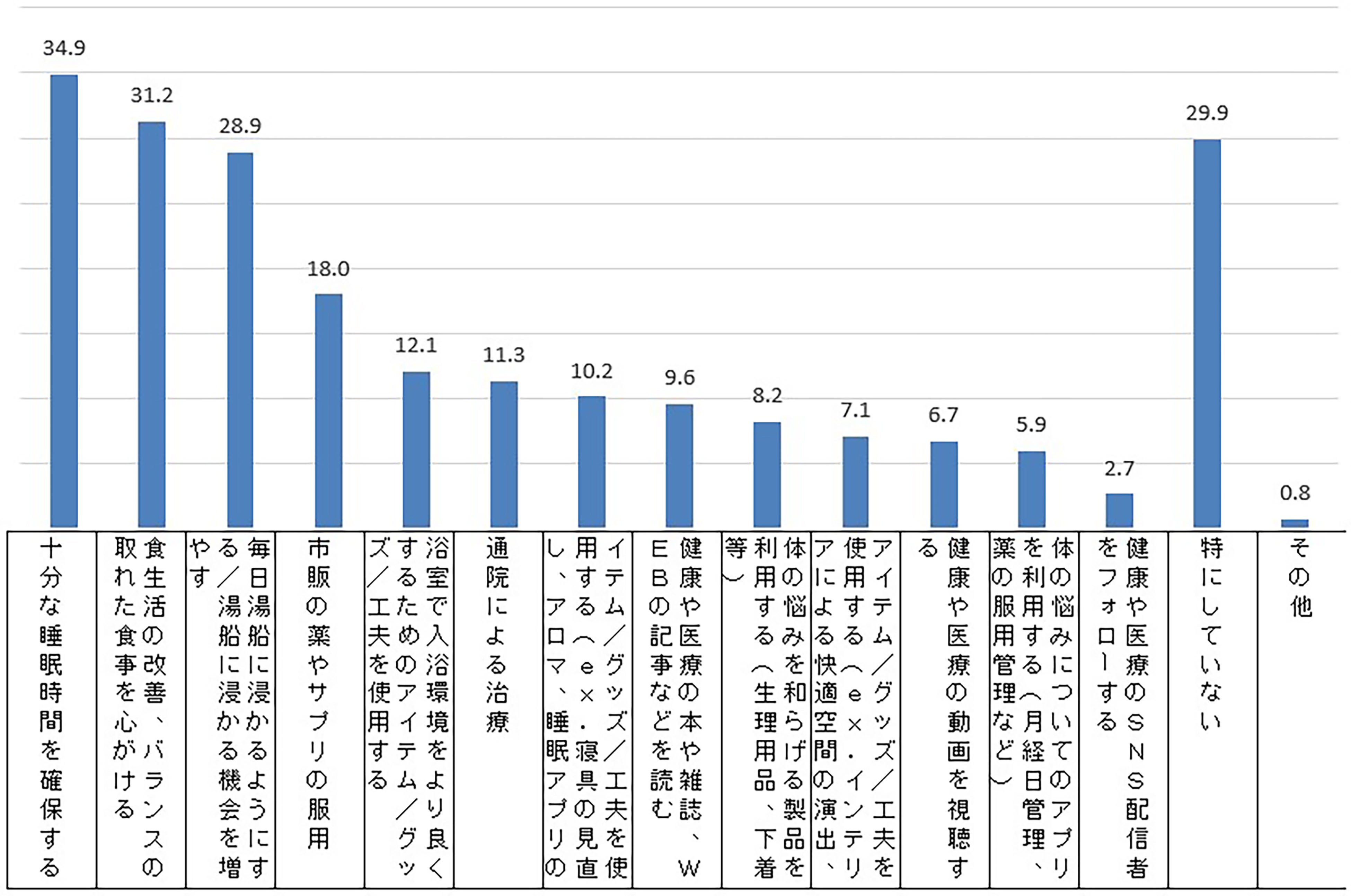 そのほか、「何らかのアイテム・グッズの活用」や「通院」といった選択肢も、提示した多くの解消策に対して10%前後の方が回答しており、女性の多くは「自身の抱える悩みに対してセルフケアを行いたい」と考えていることが分かります。
