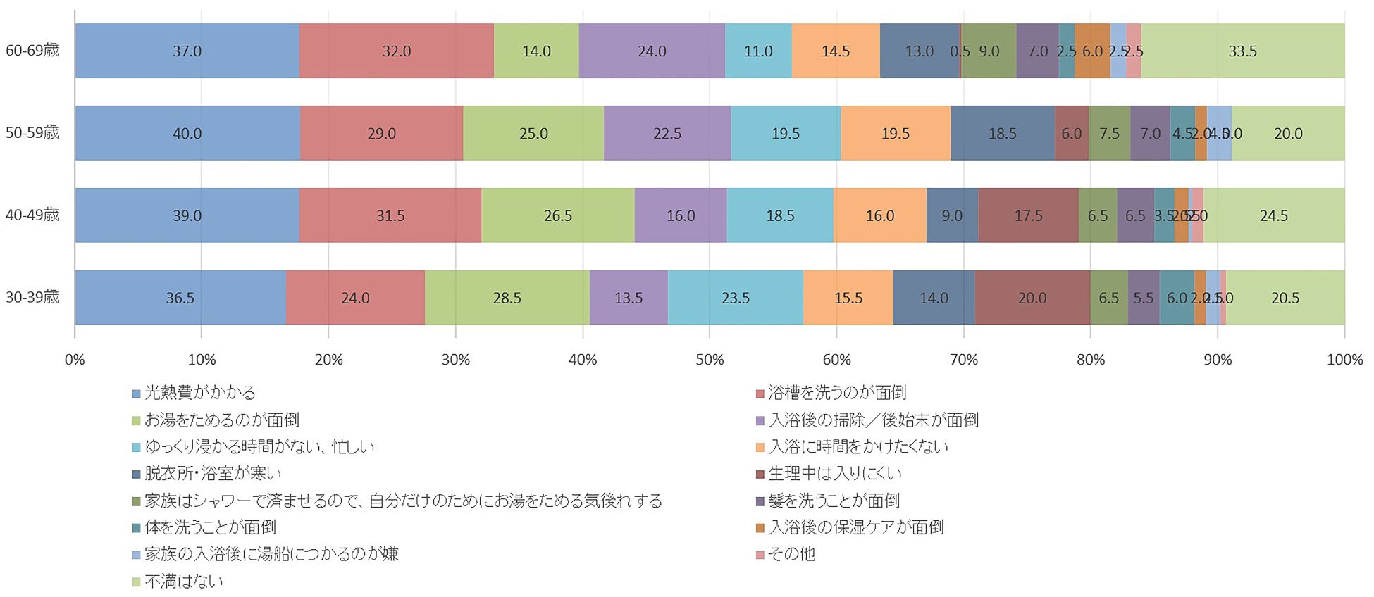 また、「湯船浴に対して感じている不満」について聞いたところ、全世代で「光熱費がかかる」というコスト面での不満がトップに入り、次いで「浴槽を洗うのが面倒」「お湯をためるのが面倒」と湯船浴の準備に対する不満が上がりました。