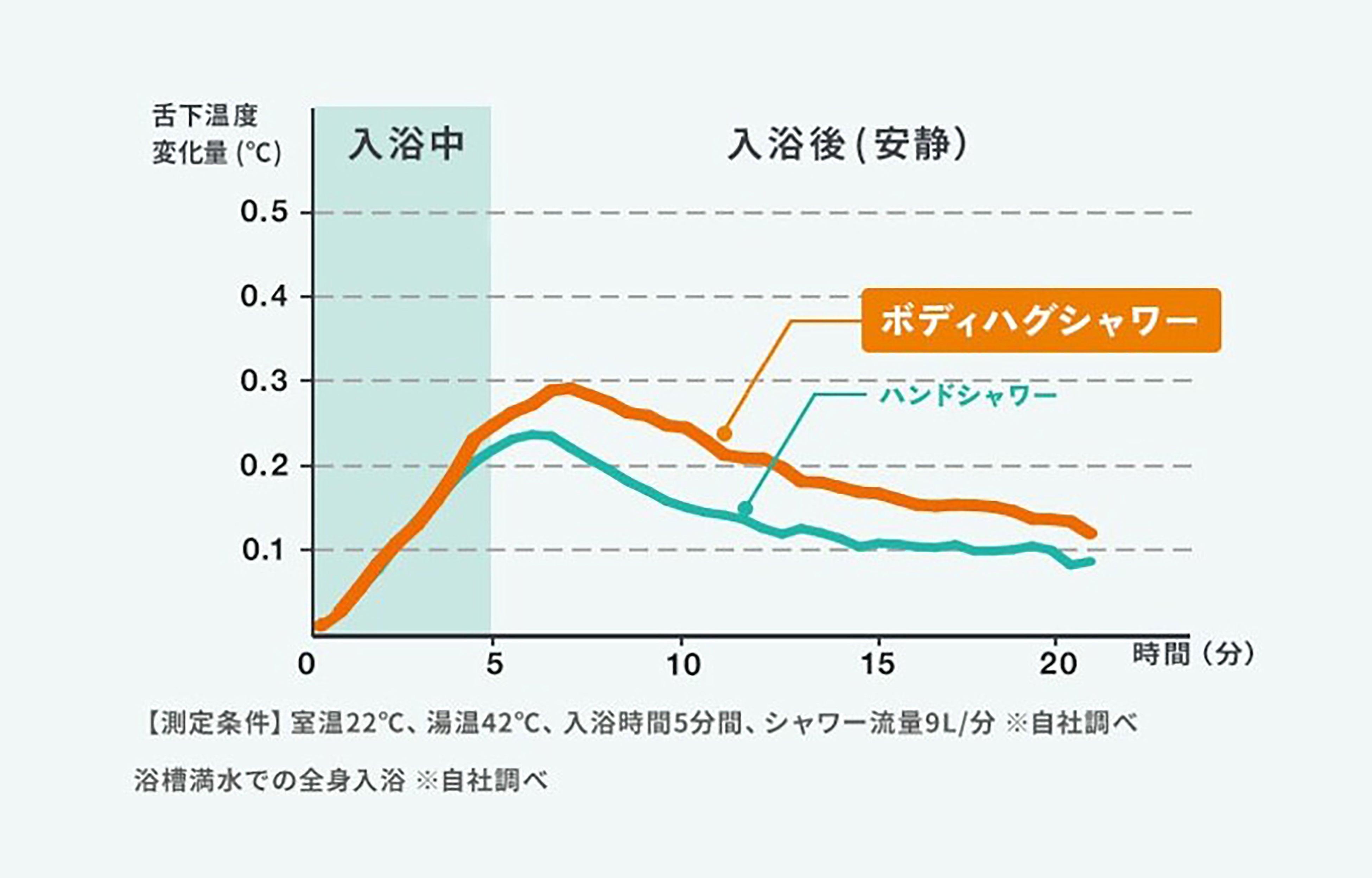 ハンドシャワーによる入浴と比べ、身体全体および首まわりにおいて入浴後の温まりが持続します。また、舌下温度計測による深部体温についても、ハンドシャワー入浴に比べて深部体温が下がりにくいと言えます。