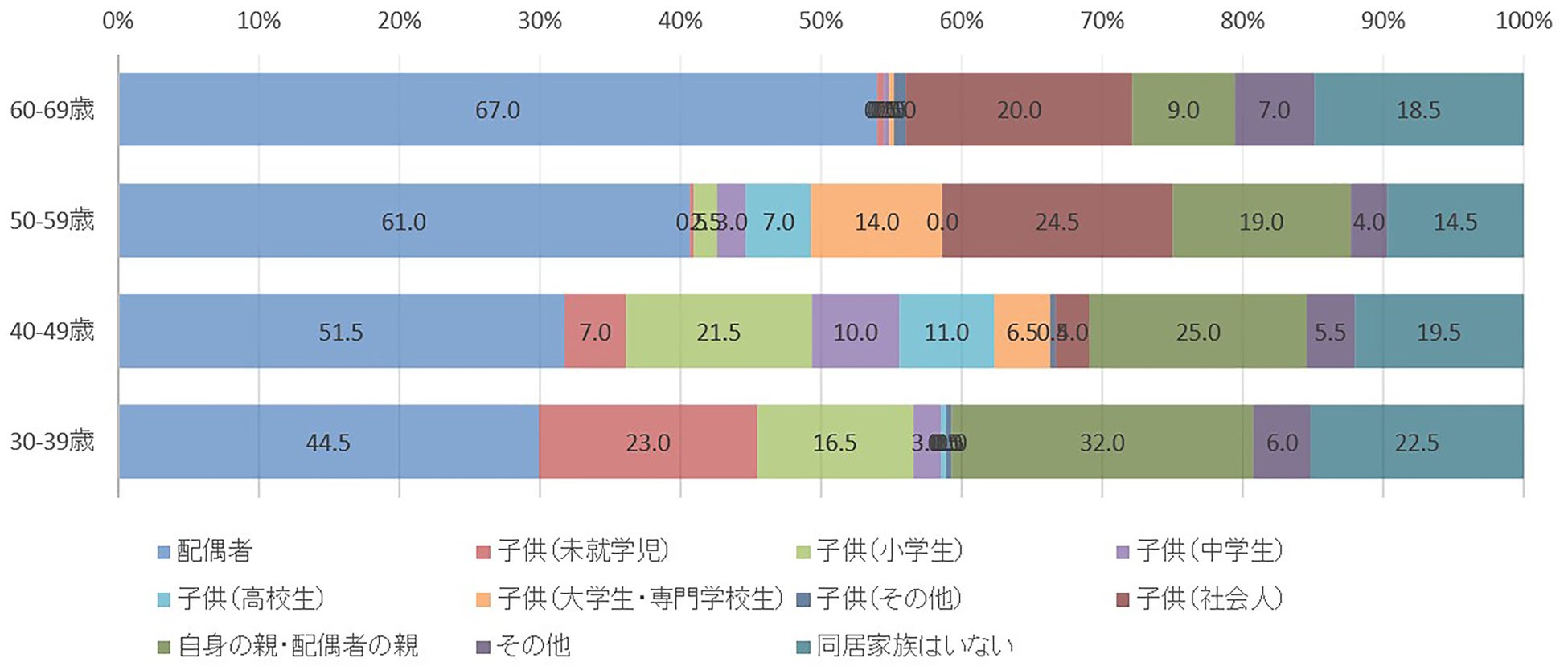 今回の調査回答者における、同居家族の状況は下図のとおりです。全体として配偶者と同居している方が半数以上を占め、特に30代~40代では子育て中の方の回答が多くなりました。