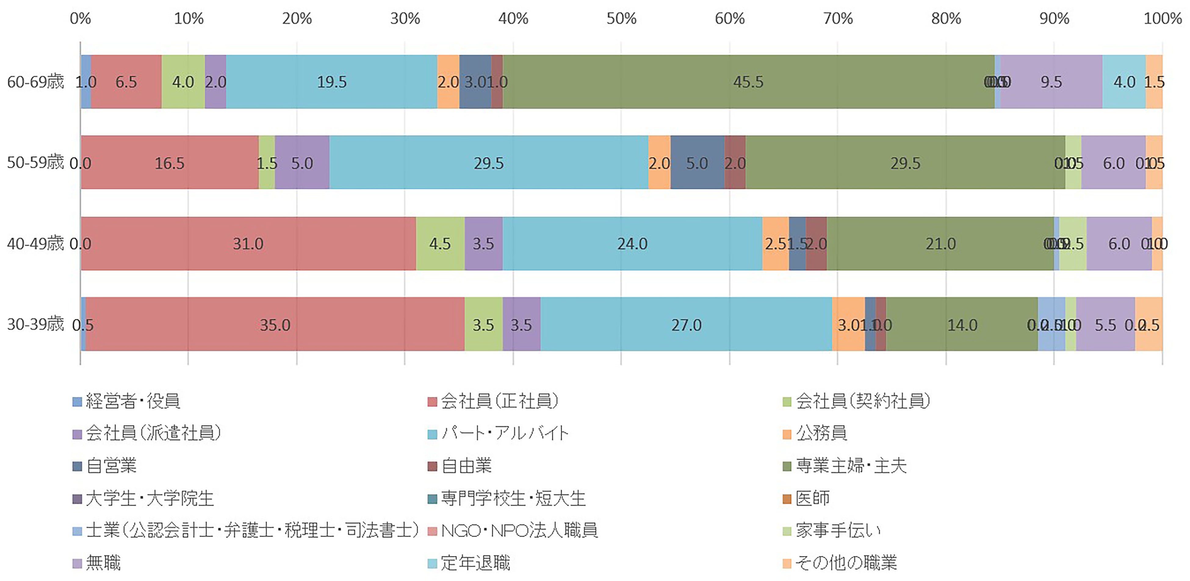 職業については、30~40代では会社員やパート・アルバイトとして働いている方が多いという結果に。50代以上に関しては、専業主婦率も高くなりました。