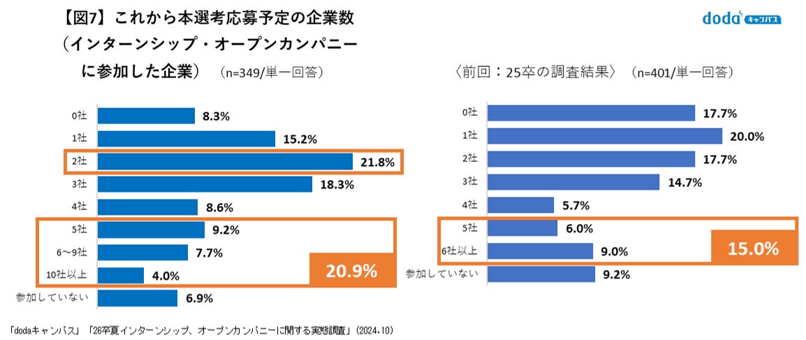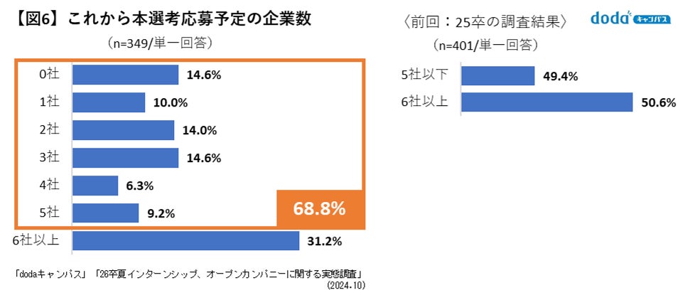 これから本選考に応募しようと思っている企業数は、「0社」から「5社」の回答合計が68.8%となり、前回調査時の49.4%から19.4ポイント増加しています。