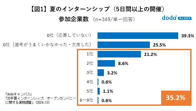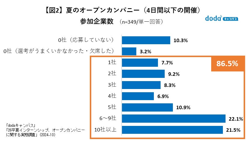 「dodaキャンパス」に登録している26卒学生を対象に、今夏のインターンシップ・オープンカンパニーの参加状況について聞いたところ、参加企業数が「1社以上」と回答した割合は、インターンシップが35.2%だったのに対し、1dayのしごと体験などを含めたオープンカンパニーは86.5%でした。