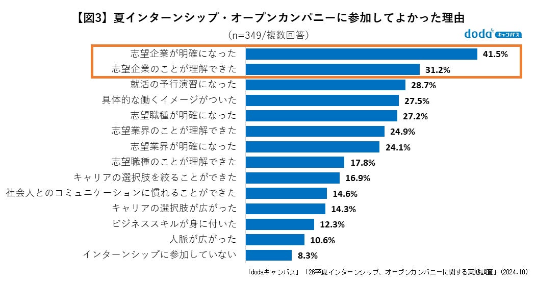 ・インターンシップ・オープンカンパニーに参加してよかった理由の1位は「志望動機が明確になった」(41.5%)