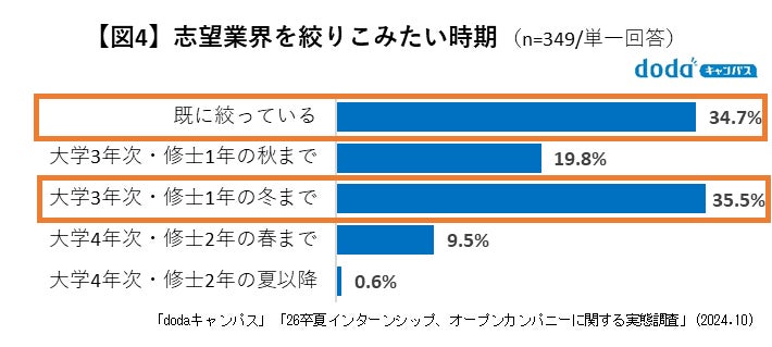 業界の絞り込み時期については、1位「大学3年・修士1年生の冬まで」(35.5%)でした。2位は「すでに絞っている」(34.7%)で、前回調査時の30.0%から4.7ポイント増加しています。