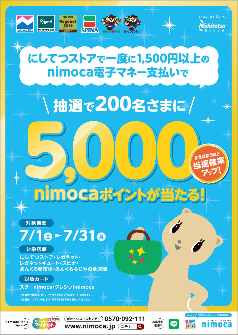 期間中、にしてつストア、レガネット、レガネットキュート、スピナ、あんくるふじや、あんくる夢市場全店にて、一度に1,500円以上nimoca電子マネー支払いでお買いものされた方の中から抽選で200名さまに、5,000nimocaポイントが当たります。