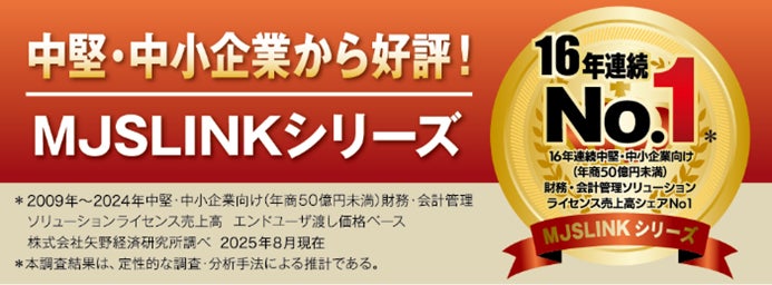財務・会計システムおよび経営情報サービスを開発・販売する株式会社ミロク情報サービス(本社:東京都新宿区、代表取締役社長:是枝 周樹、以下「MJS」)は、市場マーケティング調査会社の株式会社矢野経済研究所が発行する「2025 ERP市場の実態と展望」(※1)における、年商50億円未満の企業向け財務・会計管理ソリューションのライセンス売上高シェア調査において、『MJSLINKシリーズ』が売上高シェアNo.1を獲得しました。同調査結果において、MJSは今回で2009年から16年連続のNo.1獲得となります。