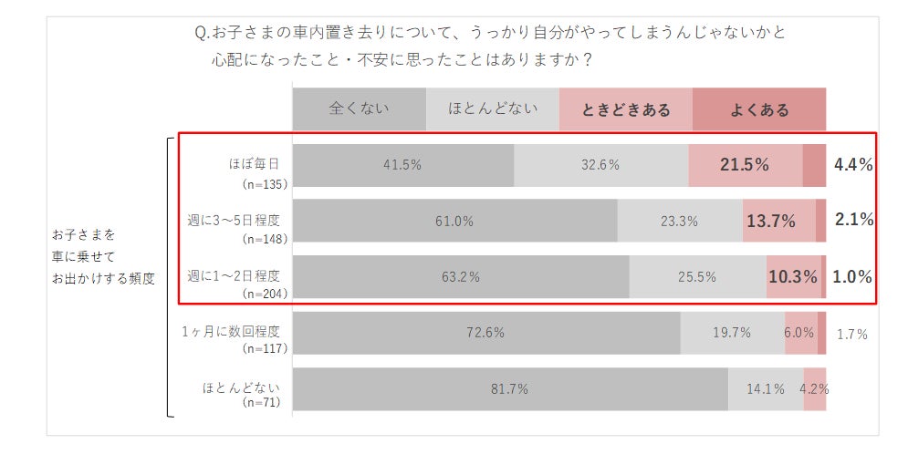 調査ではお子さまを車に乗せてお出かけする頻度は、「週に1~2日程度」が28.5%、「週に3~5日程度」が20.4%と車に乗せる機会は少なくないという結果。『お子さまの車内置き去りについて、うっかり自分がやってしまうのではないかと心配になったこと・不安に思ったことがあるか』に対しては、車に乗せてお出かけする頻度が高いほど、その心配や不安に思う割合が高いことがわかりました。