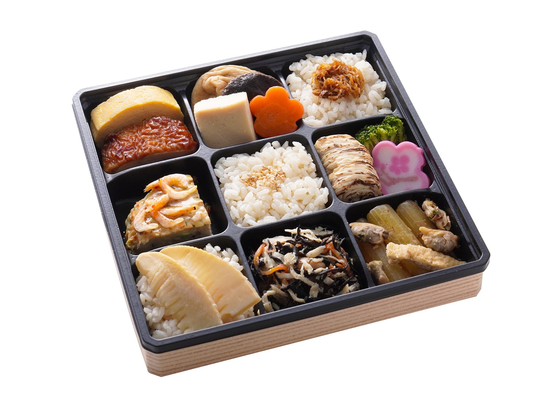 たけのこを乗せただし炊き込みご飯に、桜えび入りのだし餡をたっぷりとかけた豆腐ハンバーグや、菜の花のからし和えなどだしをきかせたおかずを詰め合せた春季限定のお弁当です。