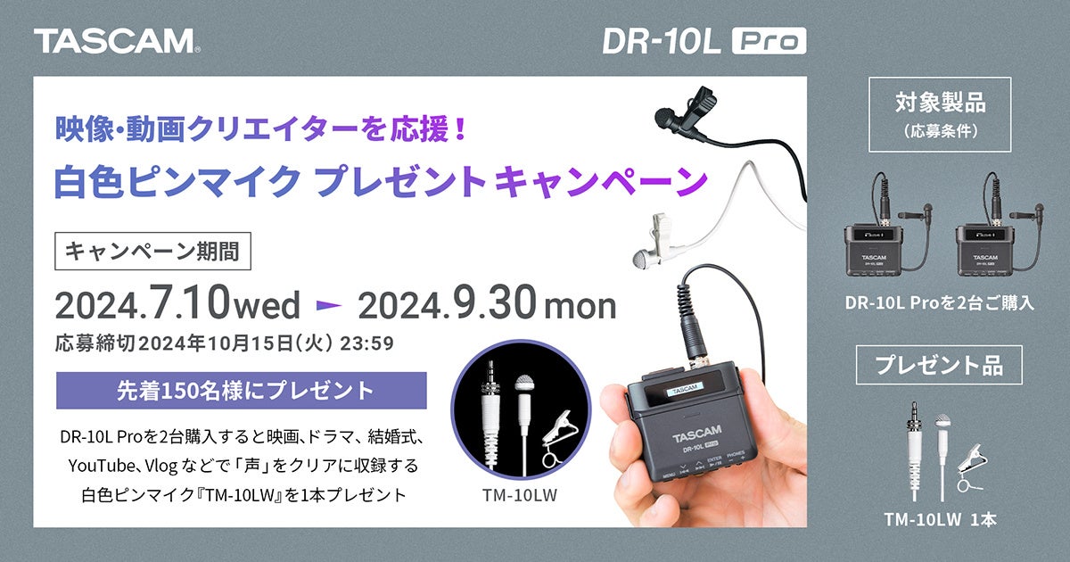 ティアック株式会社 (本社:東京都多摩市、代表取締役社長:英 裕治) は、映画、ドラマ、結婚式、YouTube、Vlogなどの「声」をクリアに収録する、32ビットフロート対応ピンマイク付き小型オーディオレコーダー TASCAM『DR-10L Pro』を2台ご購入後、キャンペーン特設サイトよりご応募いただいた先着150名様を対象に、白色ピンマイク『TM-10LW』がもらえる『映像・動画クリエイターを応援!映画、ドラマ、結婚式、YouTube、Vlogなどの「声」をクリアに収録する白色ピンマイク プレゼントキャンペーン』を実施いたします。