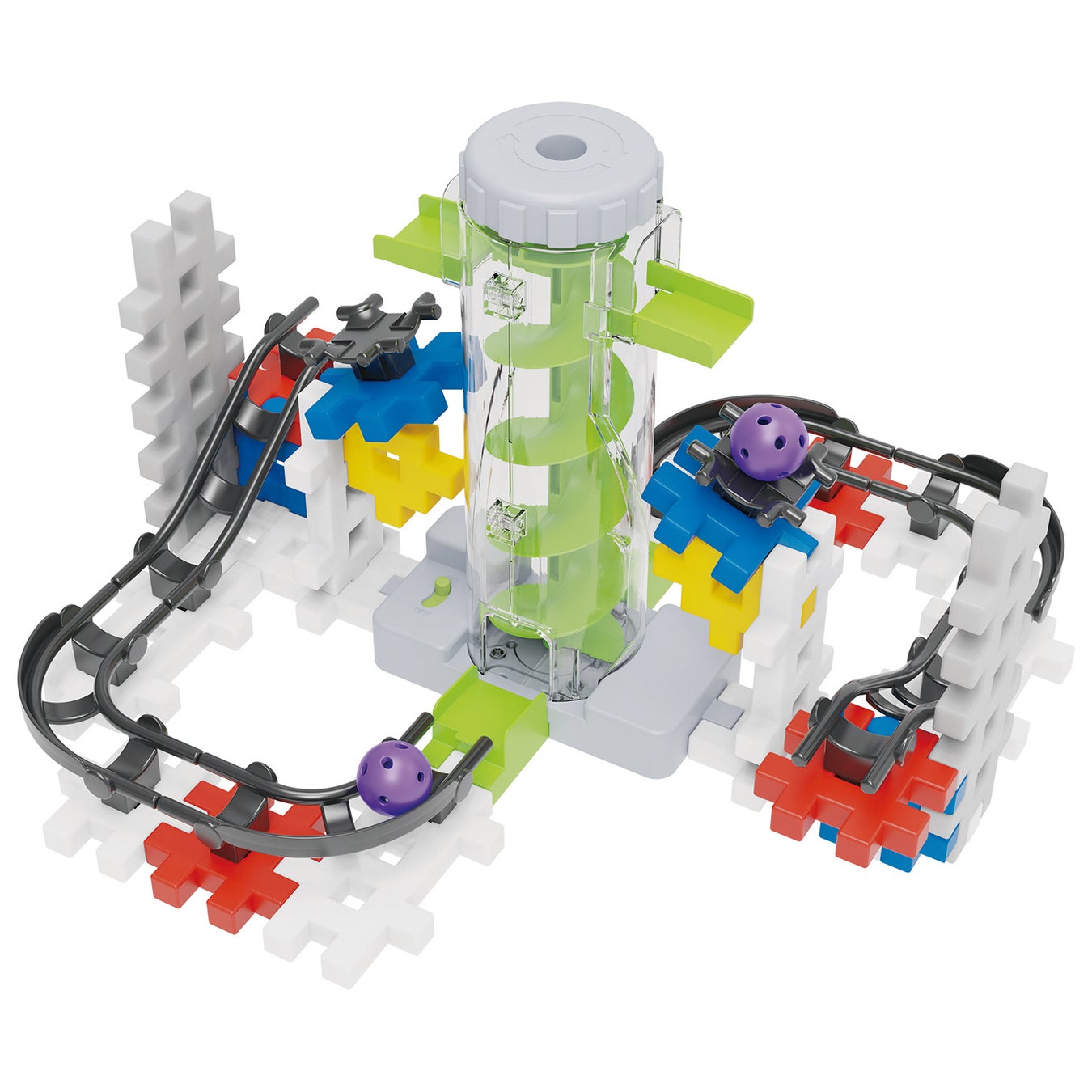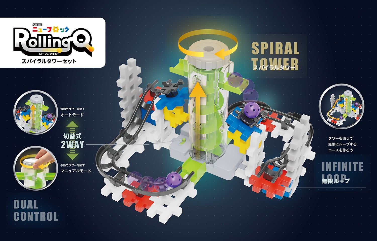ブロックを組み立てて自分でコースを作り、ボールを転がす『Gakkenニューブロックローリングキュー』シリーズに、自動でボールを上まで運ぶ「スパイラルタワー」が新登場しました。