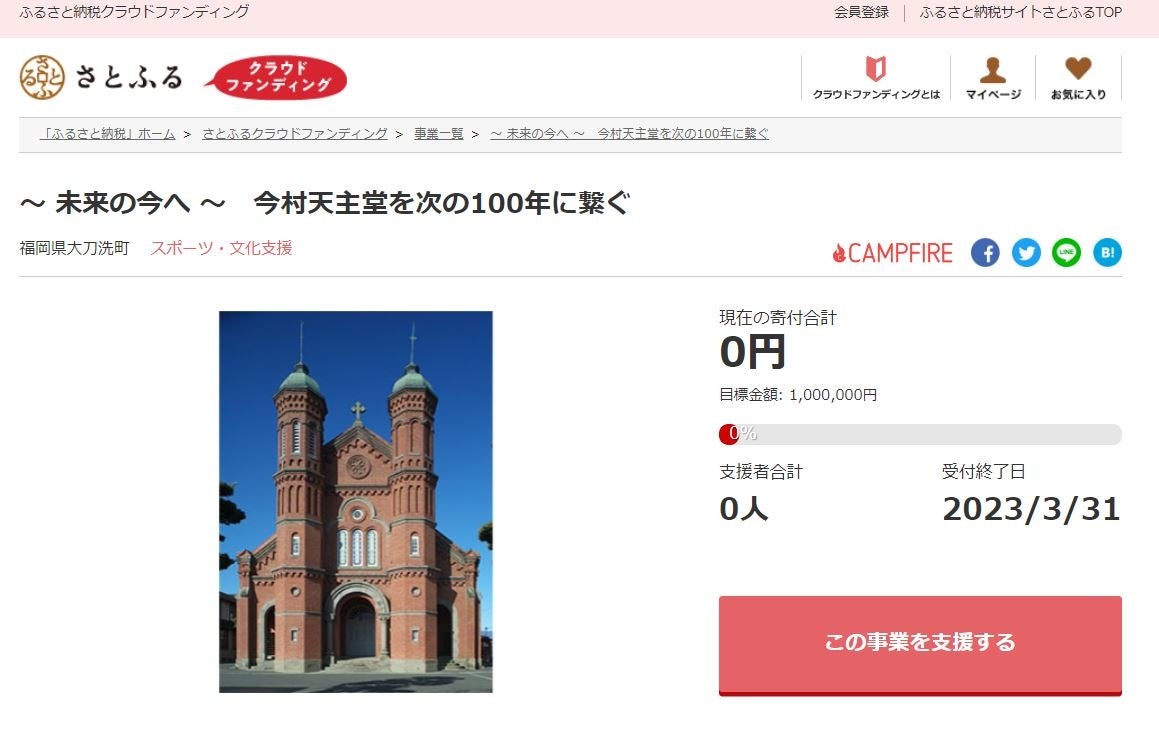 福岡県大刀洗町とふるさと納税ポータルサイト「さとふる」(https://www.satofull.jp/)を運営する株式会社さとふる(本社:東京都中央区、代表取締役社長:藤井 宏明)は、寄付金の使途に応じて事業を立ち上げ寄付を募る「さとふるクラウドファンディング」(https://www.satofull.jp/projects/top.php)にて、2022年7月20日より福岡県大刀洗町にある国の重要文化財「今村天主堂」の耐震工事や補修工事を実施し後世に残すための寄付受け付けを開始します。