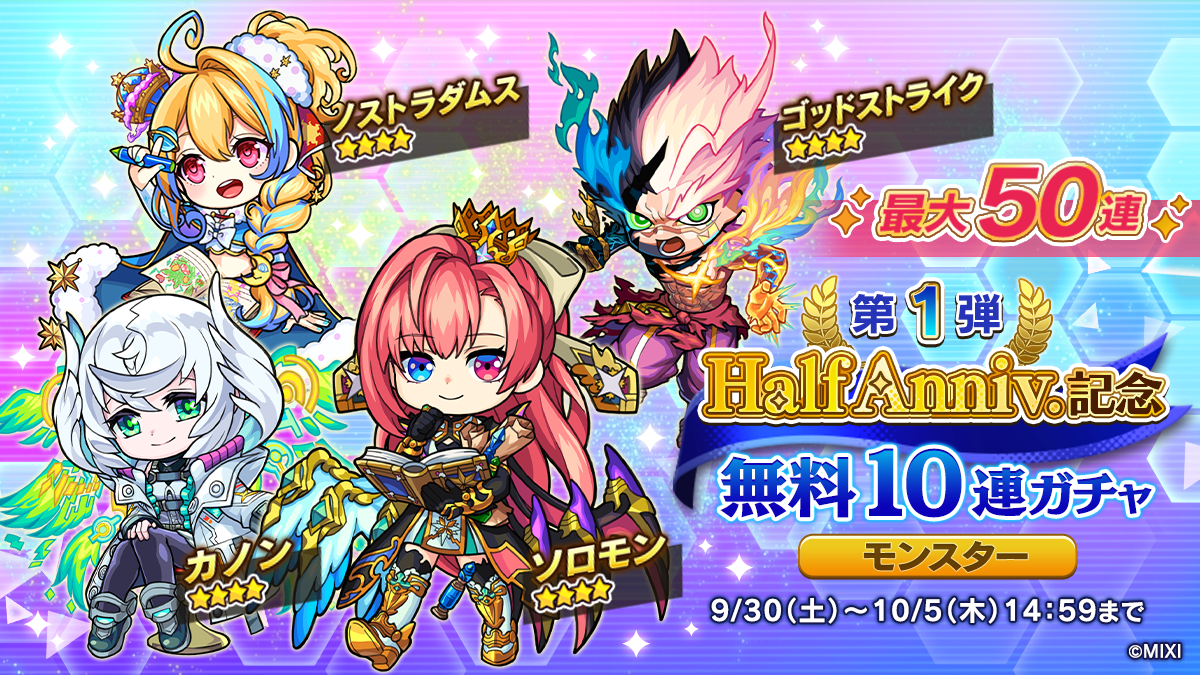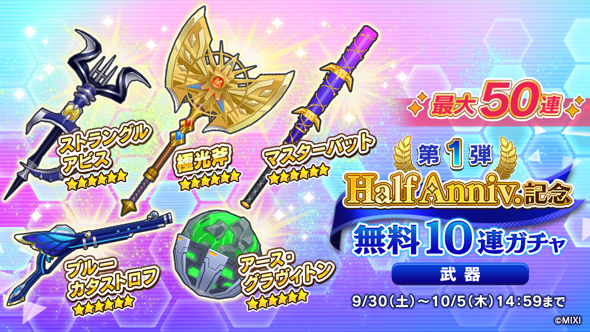 9月30日(土)より1週間ごとにモンスターと武器、それぞれ10連ガチャが無料で引ける「ハーフアニバーサリー記念無料10連モンスターガチャ」「ハーフアニバーサリー記念無料10連武器ガチャ」を開催します。毎週木曜日に更新、5週間に渡り開催予定となっており、各最大50連が引けるガチャとなります。