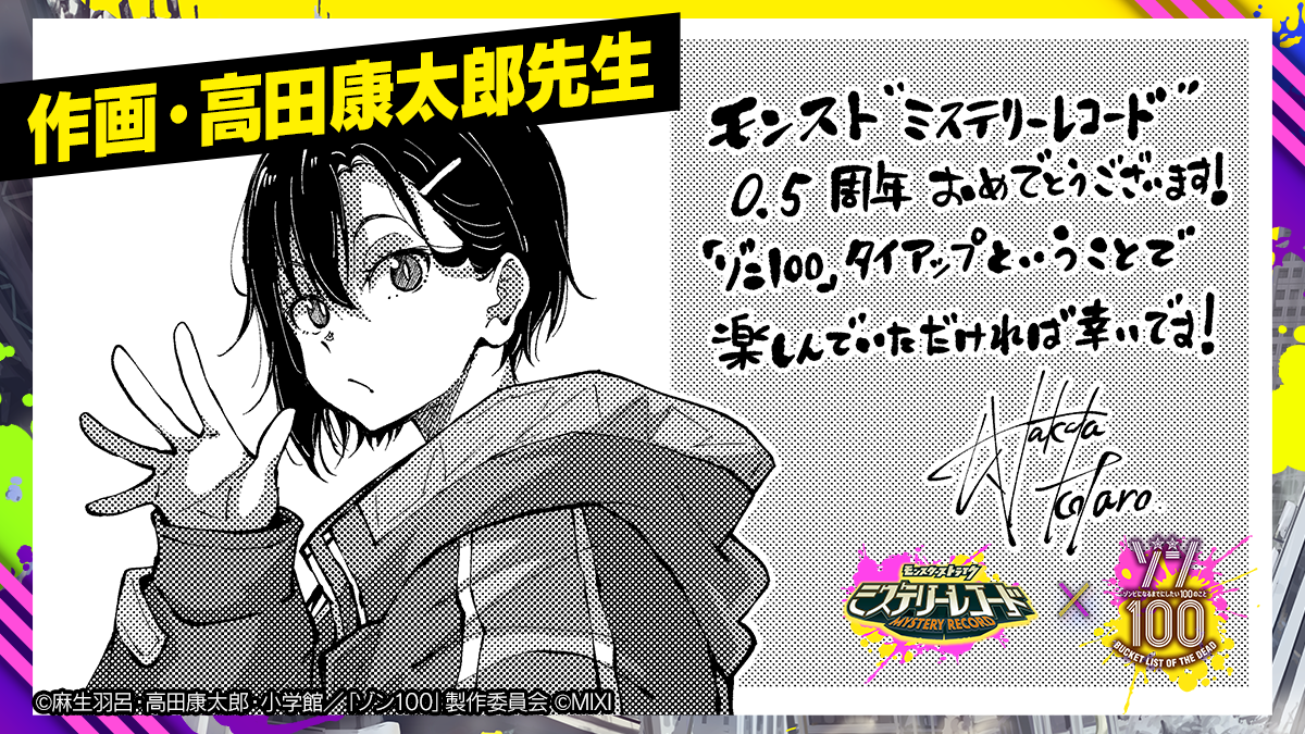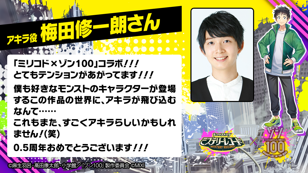 本コラボ開催を記念して、TVアニメ「ゾン100~ゾンビになるまでにしたい100のこと~」の原作者・麻生羽呂と作画者・高田康太郎、「アキラ」役の梅⽥修⼀朗、「シズカ」役の楠木ともりよりコメントを頂きました。
