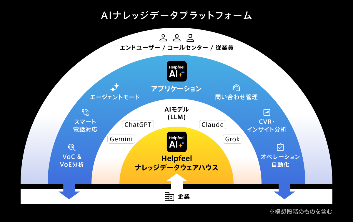 AIの性能は、参照するデータの質と構造に依存します。Helpfeelは、企業内外に散在するナレッジを構造化し、AIが正しく機能するための強固な土台として提供することで、企業の付加価値創出と業務効率化を実現します。現在、「ナレッジデータの創造・蓄積・活用」を一気通貫で支援する3つのAIプロダクトを展開しています。
