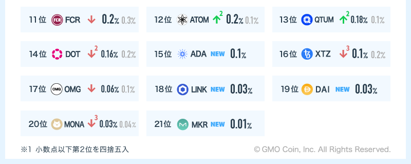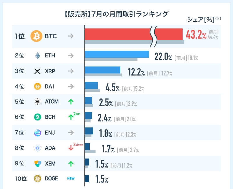 前月6月の取引ランキングと比較すると、カルダノ(ADA)、テゾス(XTZ)、チェーンリンク(LINK)が大きく順位を下げました。ドージコイン(DOGE)を新たに取扱開始し、「販売所」の銘柄数は19となりました。