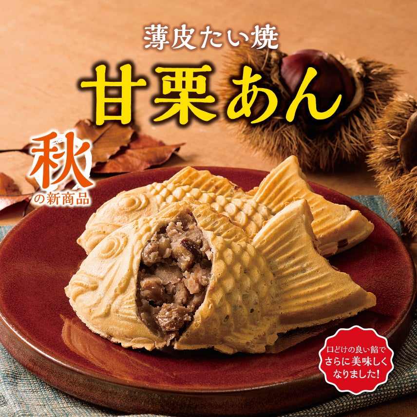 季節限定商品の中でも人気NO.1の薄皮たい焼 『甘栗あん』 は、オリジナルの鉄板に1枚1枚丁寧に流し込んだ生地に、 “特製甘栗あん” をたっぷり入れて焼き上げます。中の餡は、甘栗本来の旨み・風味を生かすため、甘さを控え大きめにカットした栗と混ぜ合わせ、こっくりとした濃厚さが特徴です。秋の訪れと共に、どこを食べてもぎっしりと甘栗の美味しさが詰まった薄皮たい焼 『甘栗あん』 をぜひご賞味ください。