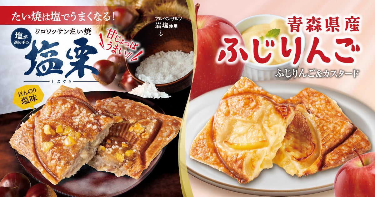 【秋の大人気限定商品】 クロワッサンたい焼 『塩栗』 ・ 『ふじりんご&カスタード』 薄皮たい焼 『甘栗あん』 の3種を、10/18(金)より同時発売!