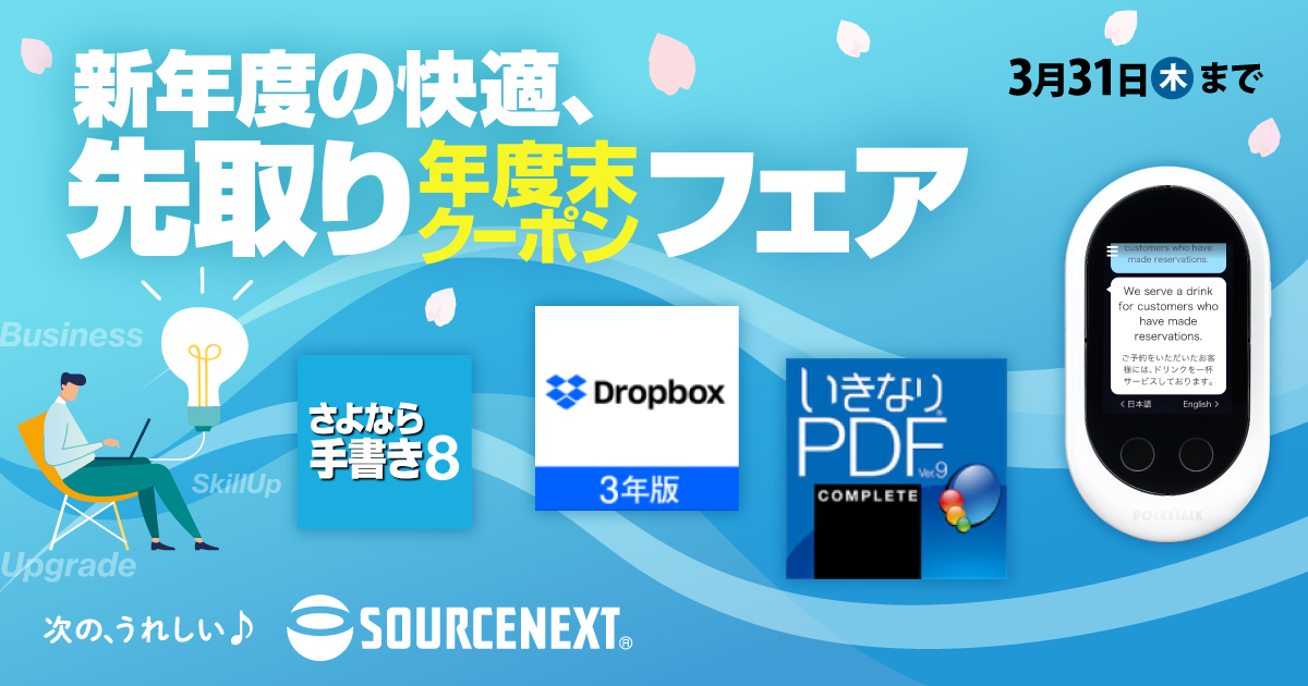 ソースネクスト株式会社(本社:東京都港区東新橋1-5-2 汐留シティセンター33階 代表取締役社長:小嶋 智彰)は、本日から3月31日(木)までの間、弊社サイト上でビジネス用の20製品を対象に「新年度の快適、先取り!年度末クーポンフェア」を開催いたします。
