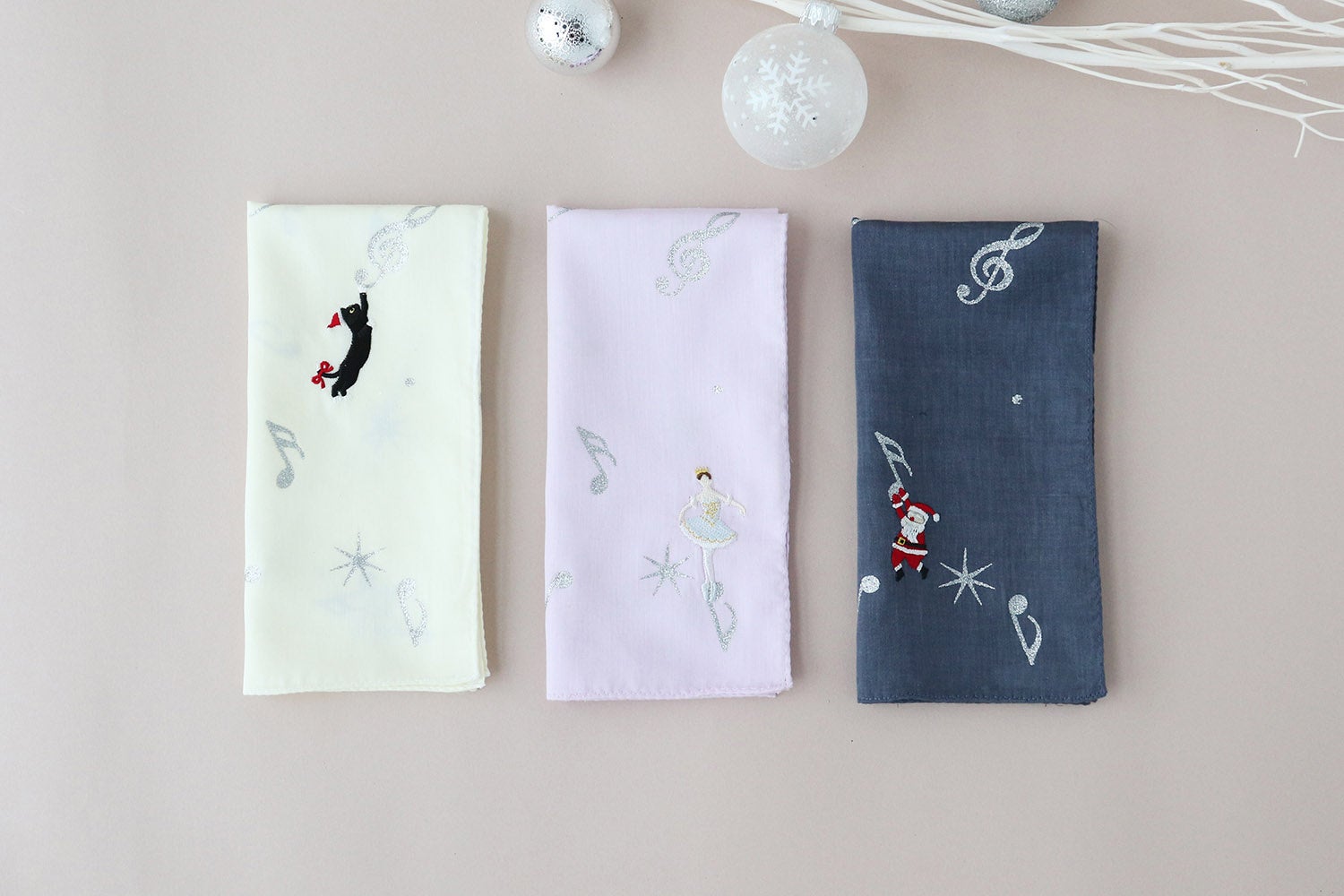モチーフにはリースやサンタクロースなど、ホリデーならではのワクワク感や楽しさを表現し、色やデザインには大人の心がときめく上品さを添えました。自分へのごほうびはもちろん、気軽なギフトから特別なひと品まで。さまざまなシーンに寄り添う、心華やぐハンカチーフコレクションです。