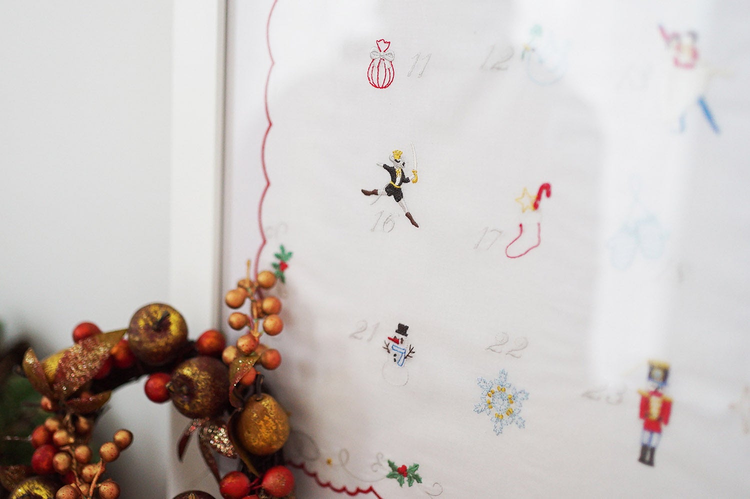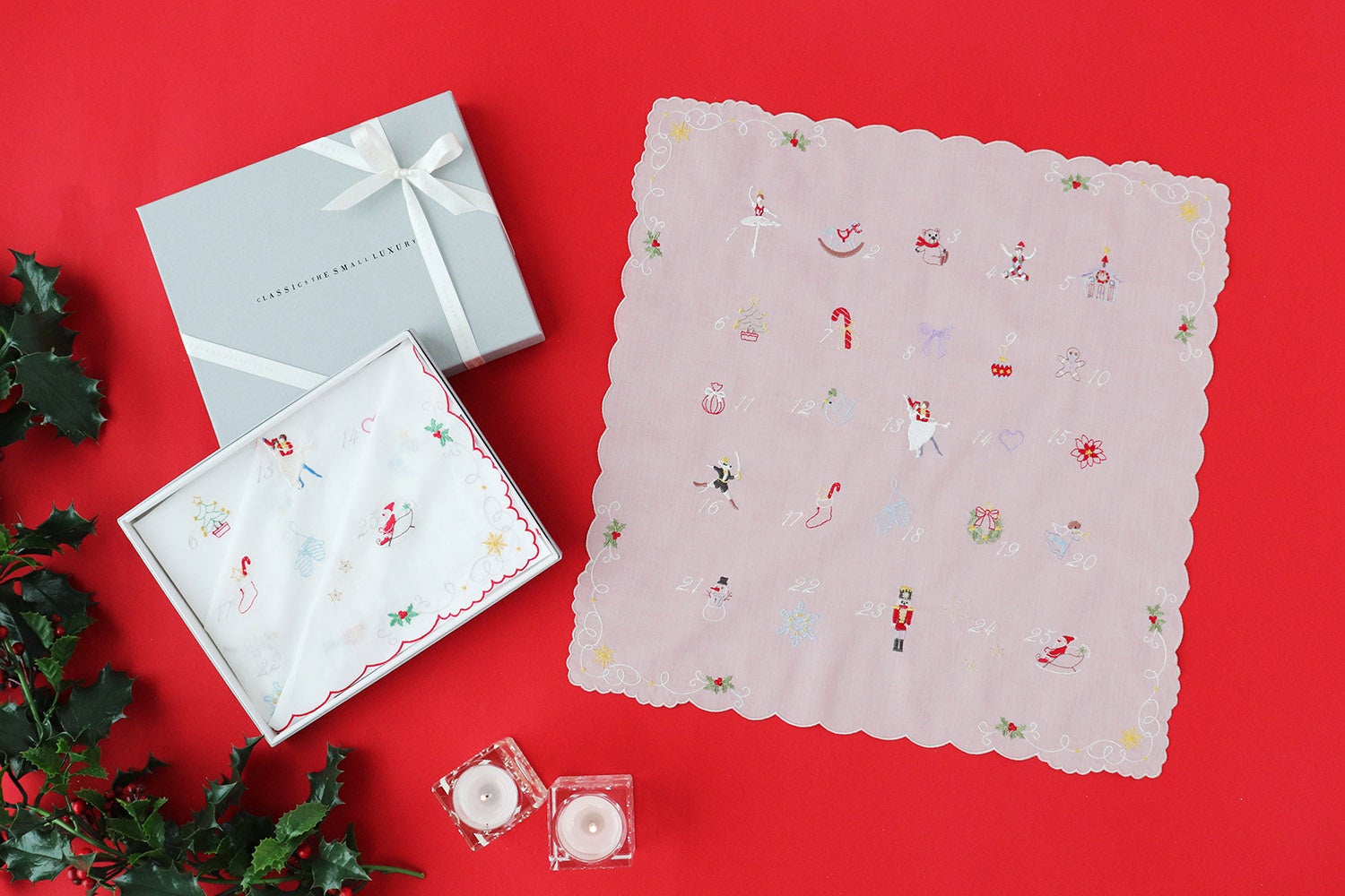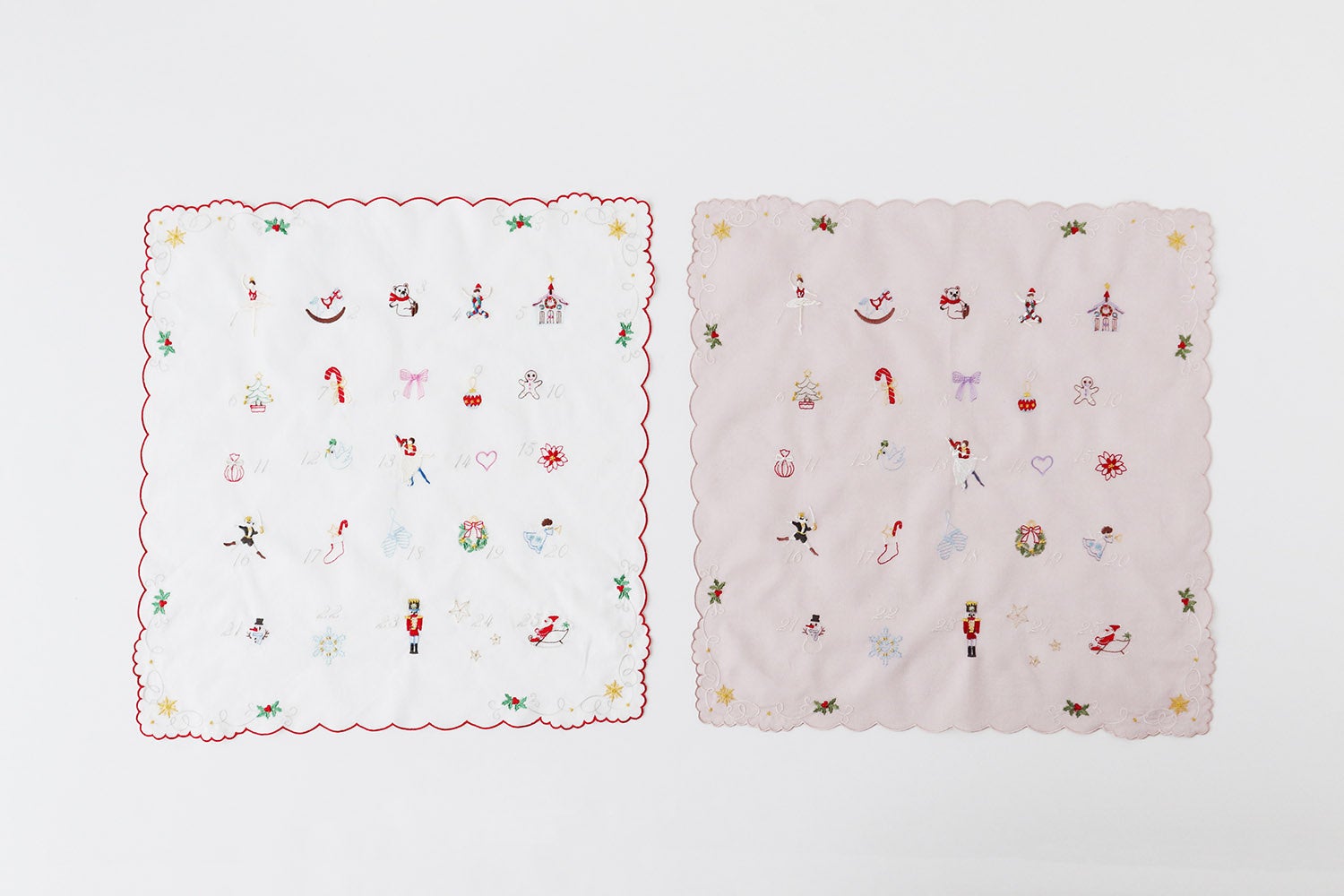 クリスマスまでの期間を楽しみながらカウントダウンするカレンダーをハンカチーフで作りました。一日ずつ、リースやサンタクロースなど、この季節ならではのモチーフを繊細に刺繍で表現しました。