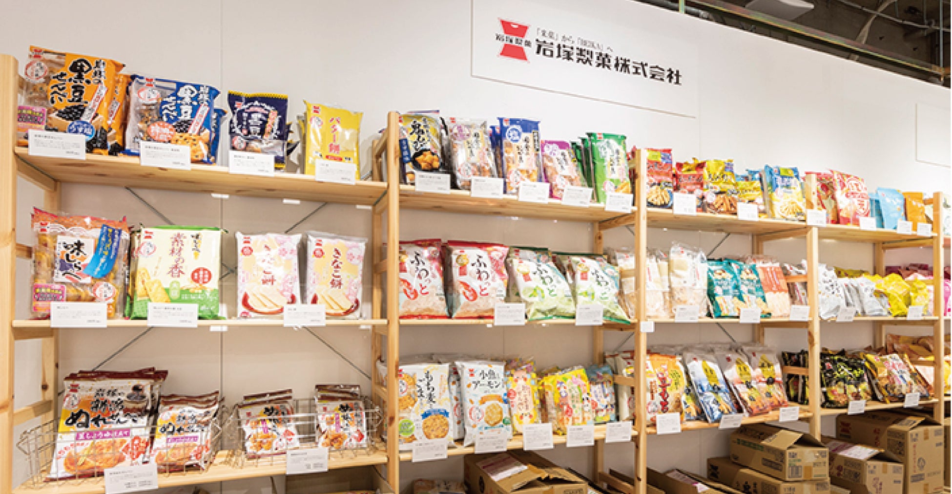 思う存分、試食をしたら、おみやげのおせんべいのお買いものもどうぞ。岩塚製菓グループのできるかぎりの全ラインナップを揃えるので、きっと、見つけたばかりのお気に入りのおせんべいもお求めいただけます。