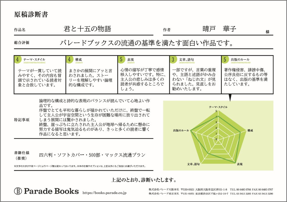 ⼀⽬であなたの原稿の傾向がわかり、出版に向けての対策が⽴てられるパレードブックスオリジナルの原稿診断書をご送付します。SNSへの掲載も⼤歓迎。この機会に、ぜひ原稿診断書を⼿に⼊れましょう!