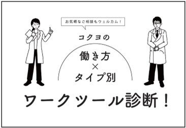 コクヨの商品企画担当が、あなたの働き方&タイプを診断。すぐに取り入れられるコクヨ式のくふうを処方!「書類、どう整理すればいい?」「自宅でのフリーアドレス状態。非効率だな~」などお気軽なご相談もウェルカム!