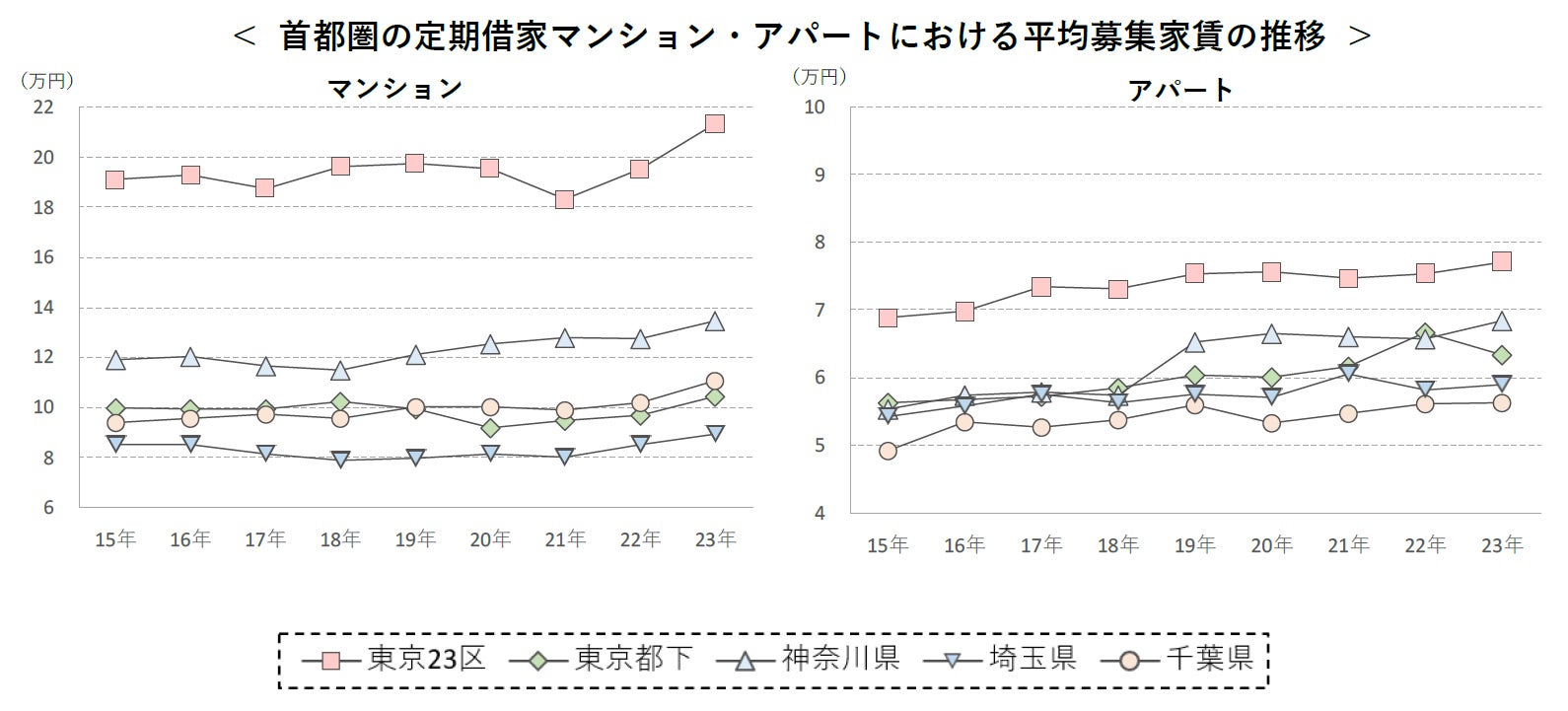 定期借家アパートの平均募集家賃も概ね上昇傾向。ファミリー向きの上昇率が全体的に高いものの、東京都下では前年度比-4.8%と唯一下落。